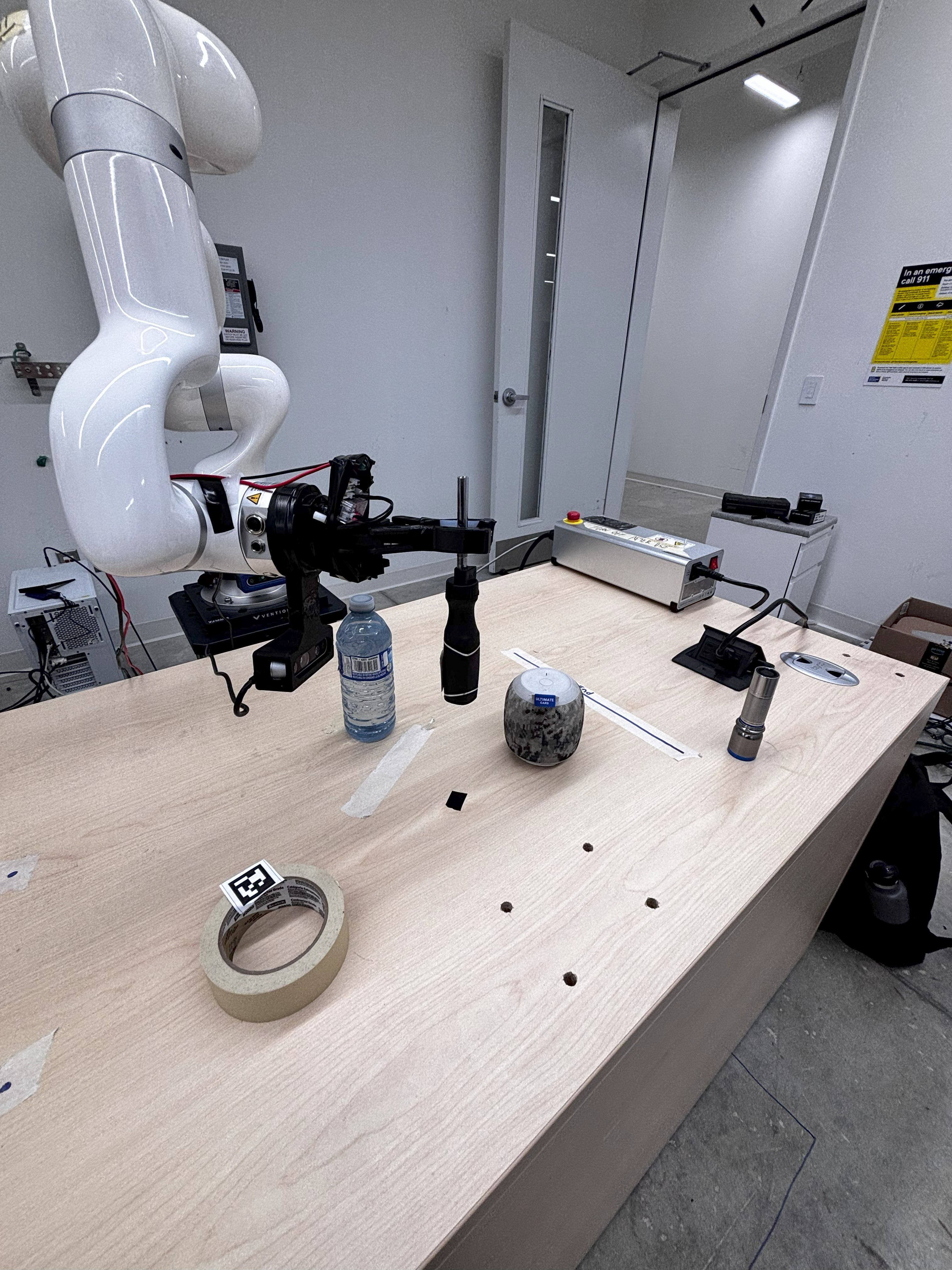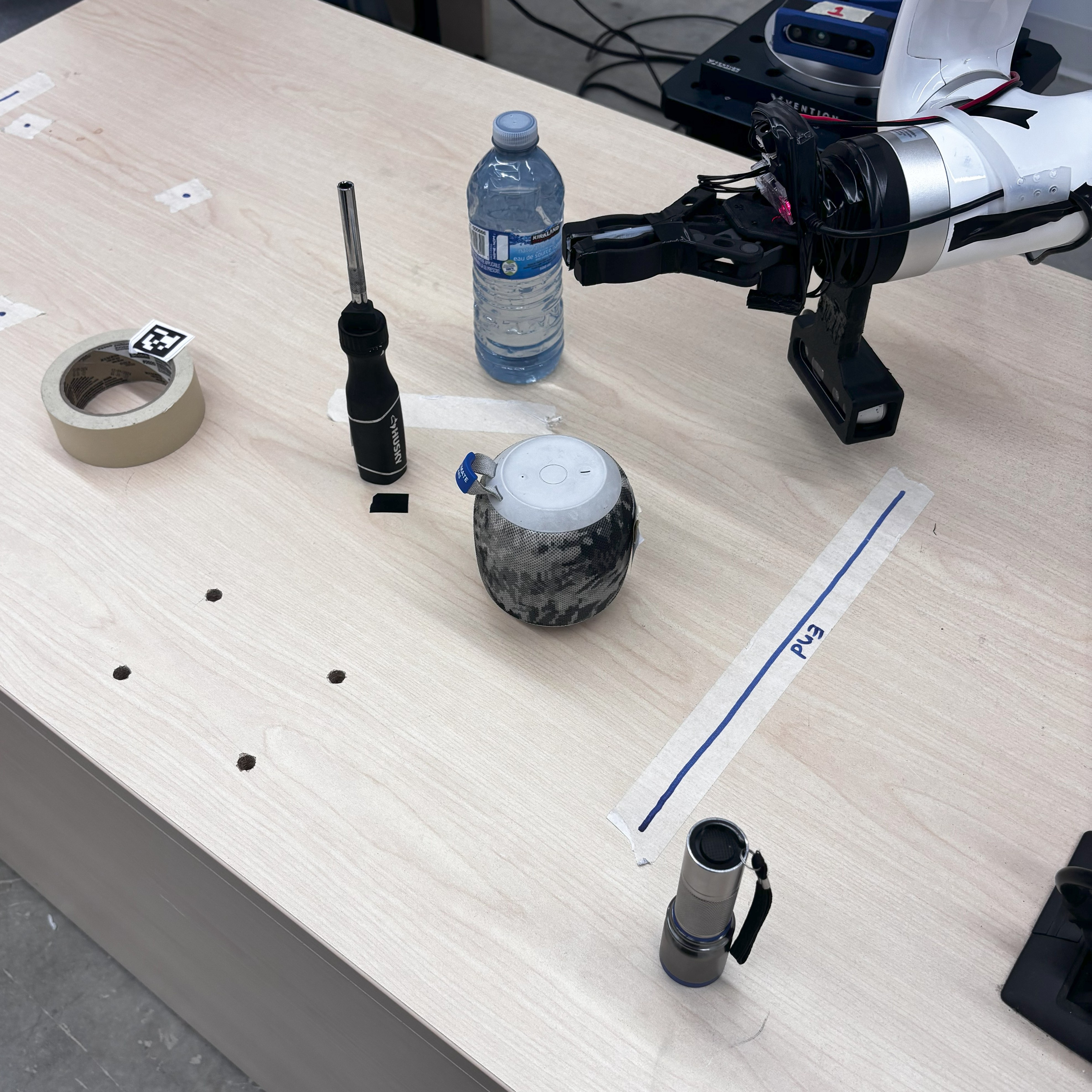 We evaluate ARRC in a tabletop manipulation setting with common items that are easy to identify. Scenarios include scanning with fallback arcs, approach and grasp with guarded Z retreat, and structured place on a pose target. The setup is designed to exercise retrieval prompts, plan synthesis, and safety gates.