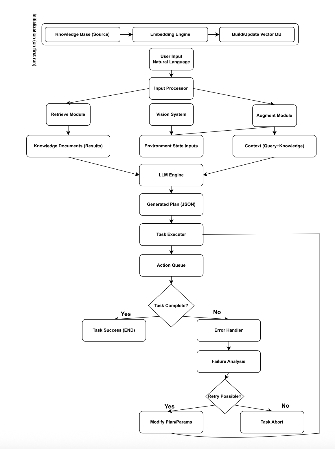 ARRC has three components: 1) Dialog and retrieval: user goals and environment notes condition retrieval over a curated knowledge base, then an LLM drafts a sub task plan with task space waypoints. 2) Plan validation: environment checks confirm reachability and collisions, and invalid steps trigger a short in context repair. 3) Execution: a motion layer translates poses to xArm waypoints with guarded speeds and force limits.